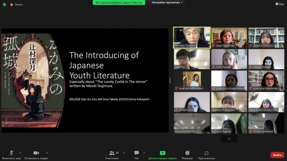 Наступна доповідь студентів Toko Go, Sora Takeda, Aina Kobayashi із Saitama University була присвячена роману сучасної японської письменниці Mizuki Tsujimura “The Lonely Castle in the Mirror.” Японські студенти розкрили провідні теми й образи цього твору, що особливо цікаві молоді, спонукають її до роздумів.