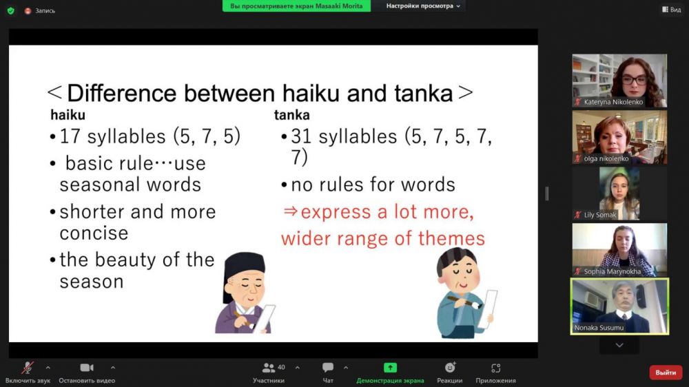 Розпочали наукове зібрання студенти Saitama University – Asumi Takahashi, Masaaki Morita. Вони підготували доповідь щодо древнього жанру японської поезії – танка. Японські студенти розповіли про відмінності танка і хайку, про різновиди танка і значення цього жанру для традиційної японської культури.