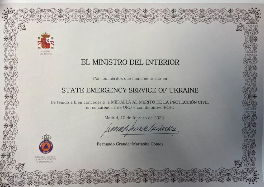ДСНС відзначено «Золотою медаллю за заслуги у сфері цивільного захисту» у Мадриді